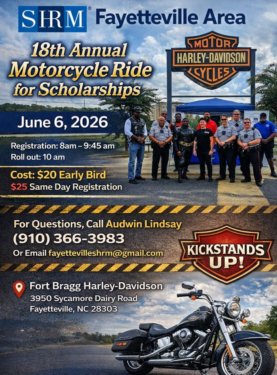 Join SHRM Fayetteville Area (FASHRM) for our 18th Annual Motorcycle Ride for Scholarships! All proceeds go directly toward providing scholarships for local students pursuing careers in Human Resources. Whether you are a seasoned rider or simply want to support a great cause,...