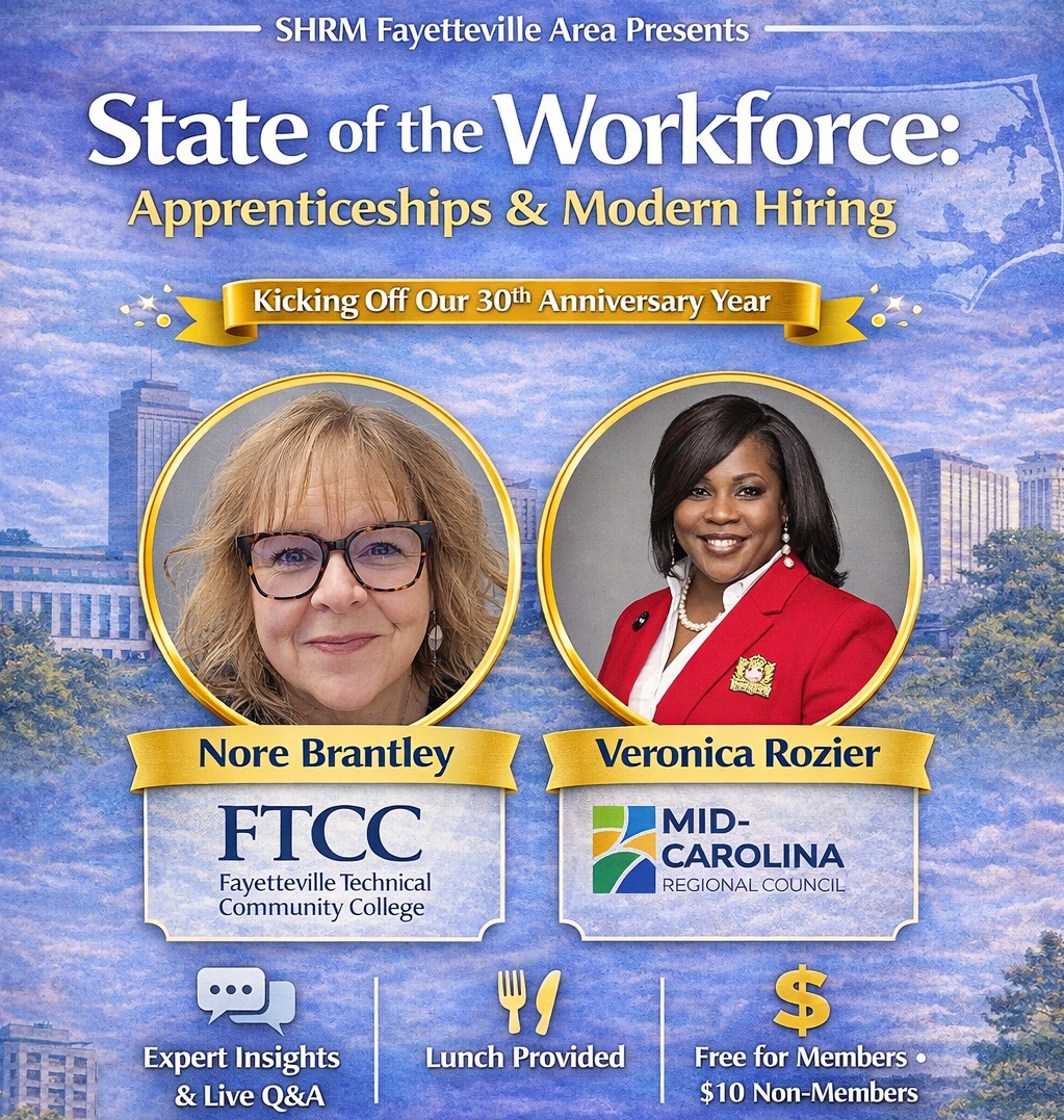 Kick off SHRM Fayetteville Area’s 30th anniversary year with a State of the Workforce conversation grounded in today’s hiring realities. As labor markets shift, traditional hiring pipelines are no longer sufficient on their own. Employers across North Carolina are responding by rethinking how talent is developed, not just recruited.
